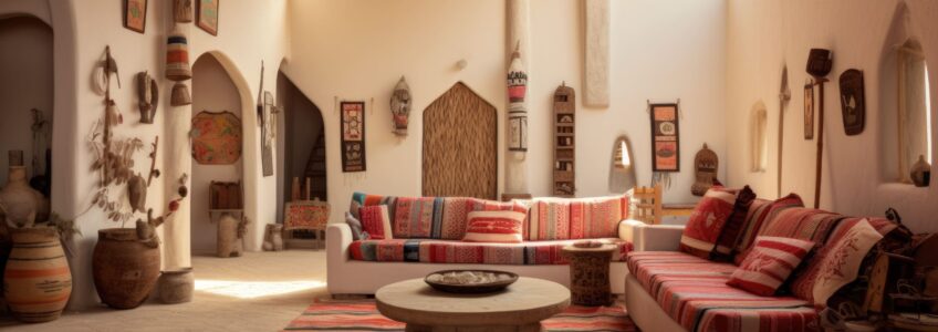 Arabic furnishings are known for their geometric patterns, prints that look like tiles, and Islamic writing. Bring these in with patterned rugs, colourful pillows, wall art, or custom-etched mirrors that show off your cultural history.